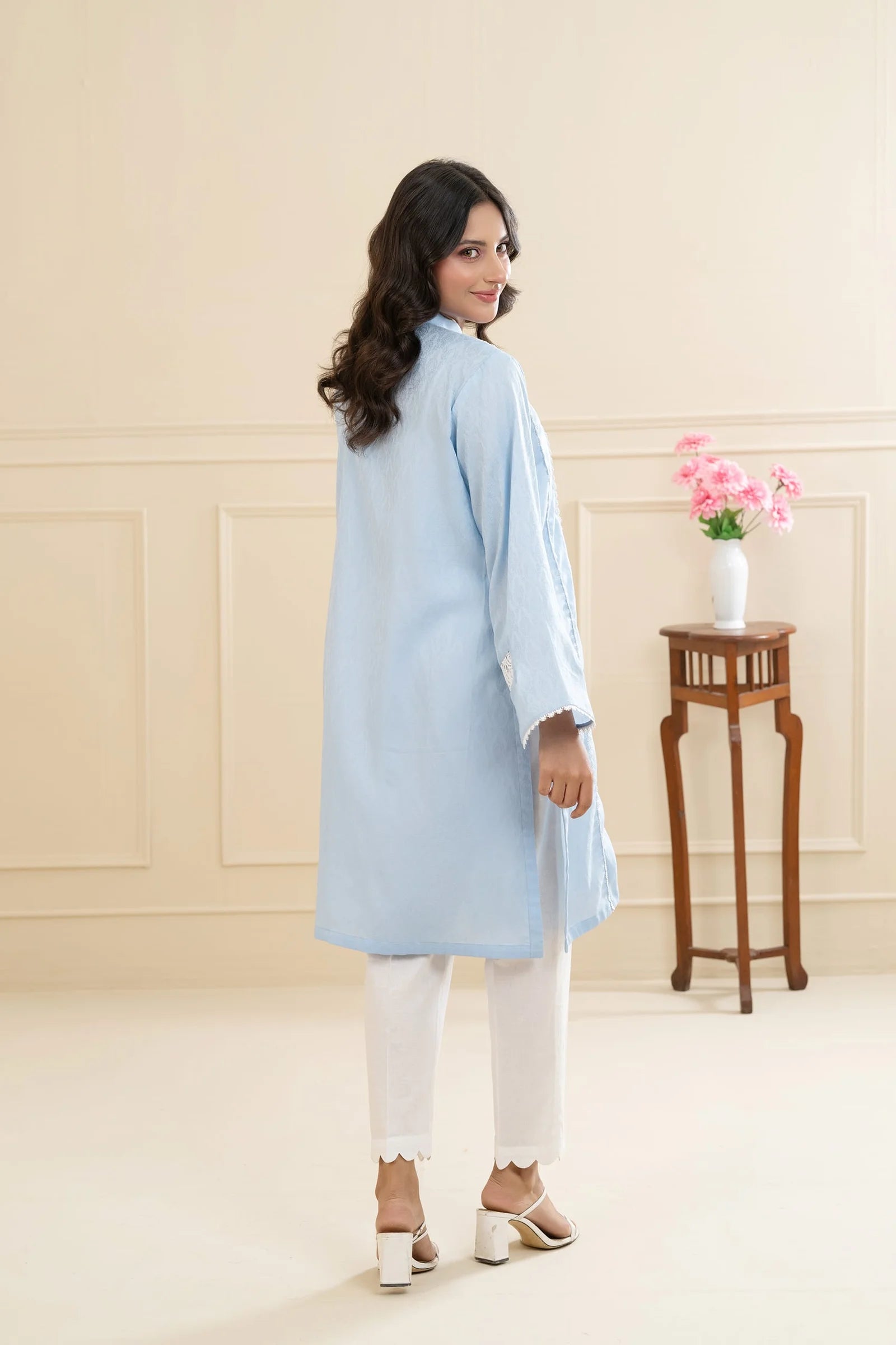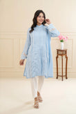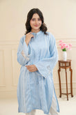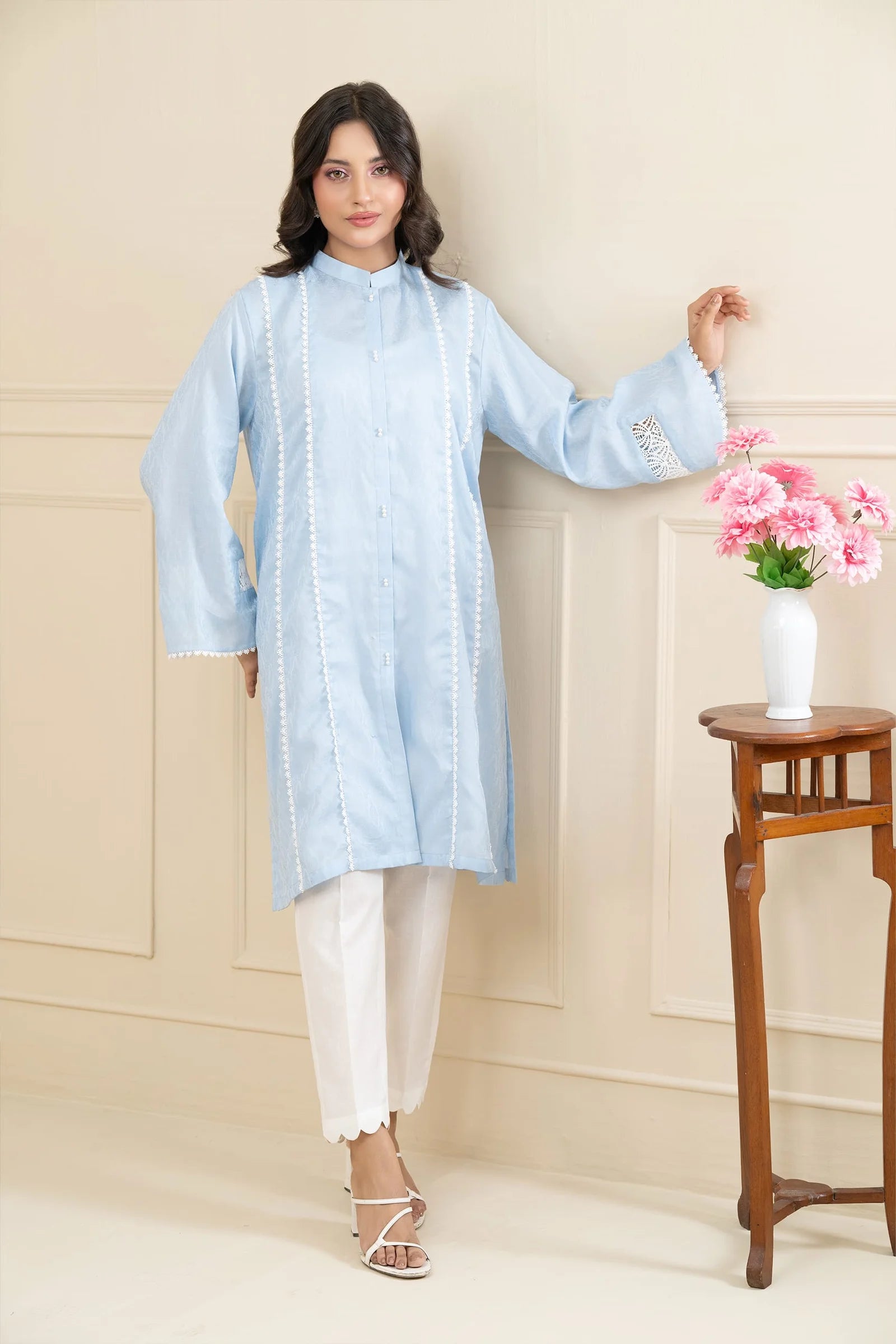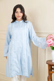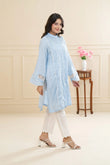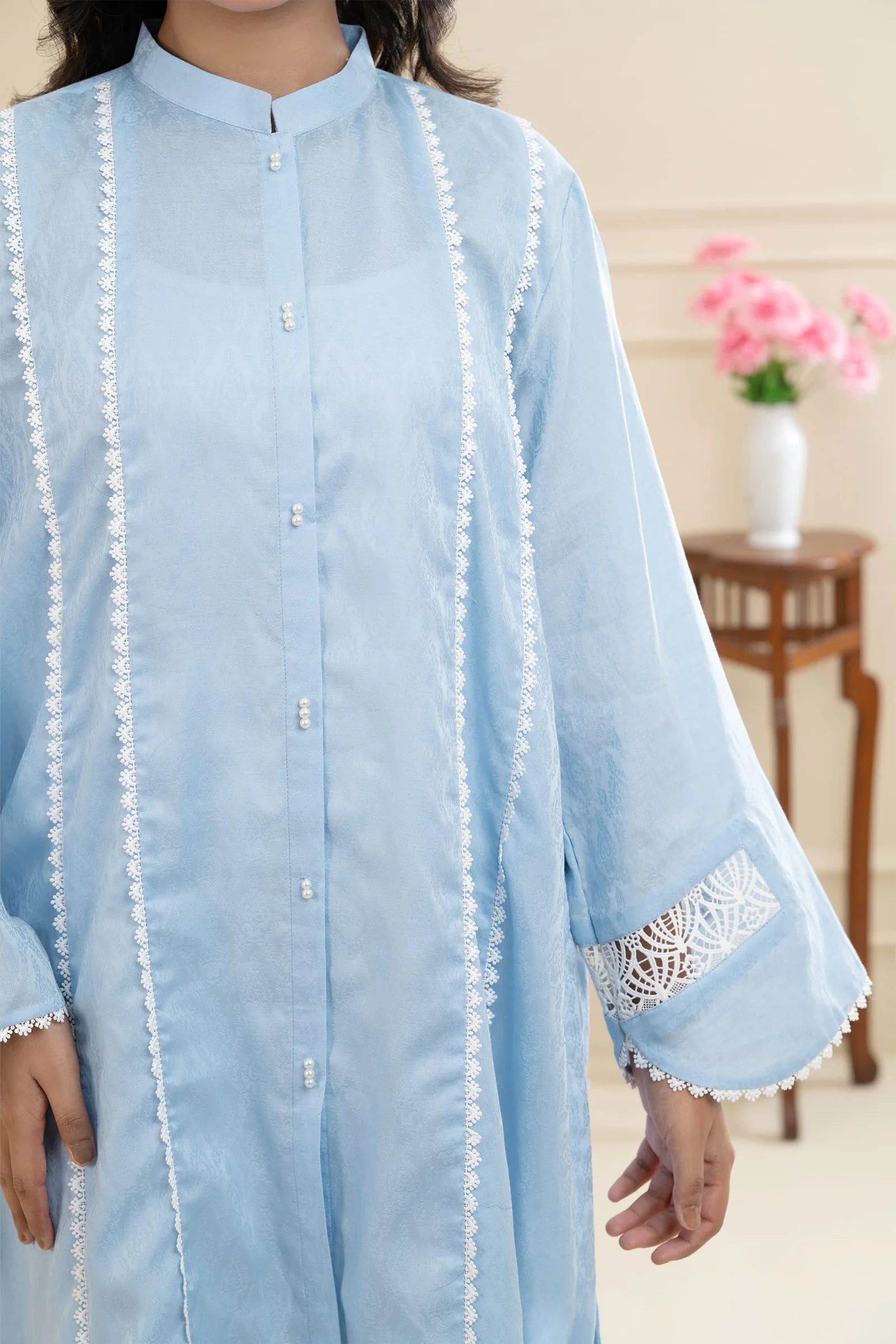 A soft pastel blue lawn outfit adorned with lace and delicate pearl accents, creating a refined and graceful look. The straight sleeves feature lace inserts for added charm, while the button-down neckline enhances its modern elegance.